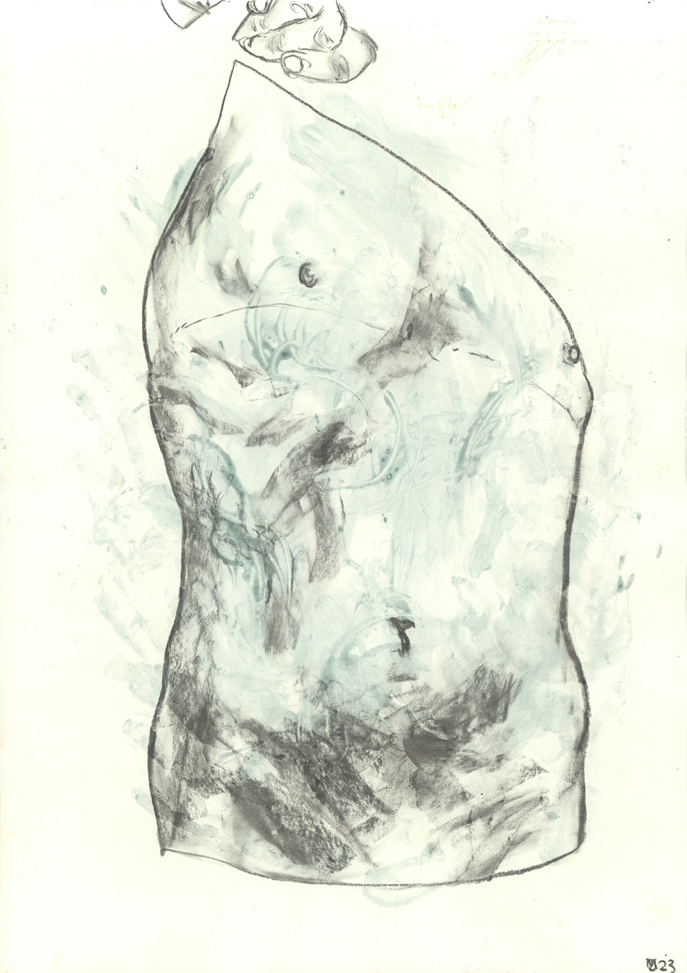 Charcoal and dish soap, and the sketch. Both drawings are on A2 paper.
