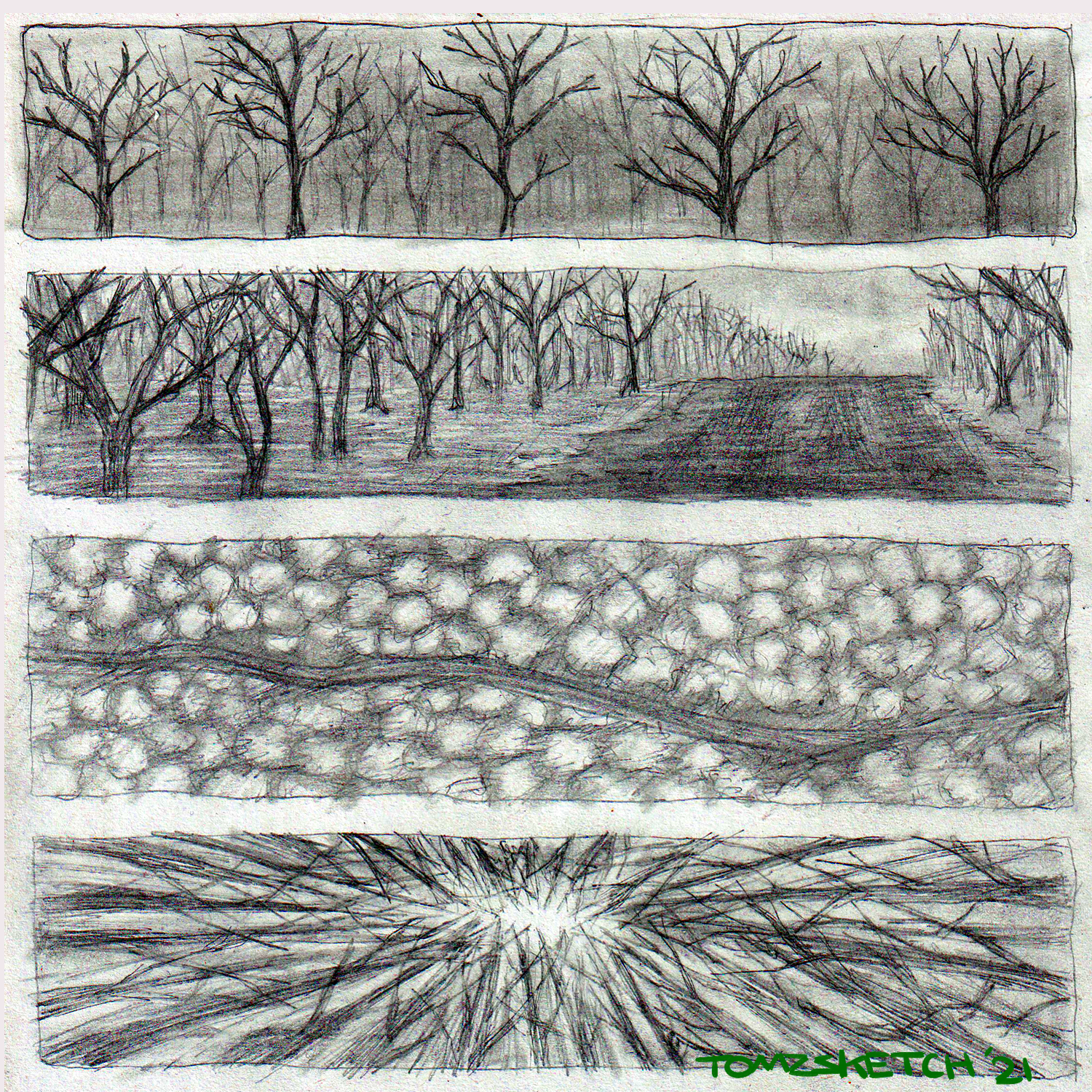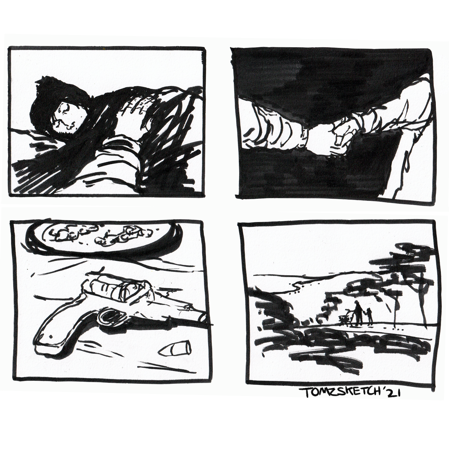 Single page comic based off the first two pages of Cormac McCarthy's post-apocalyptic novel "The Road.” Final comic page and preliminary sketches and comic ideas below.